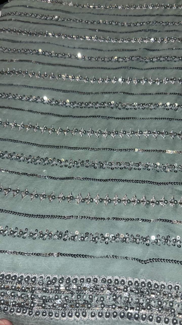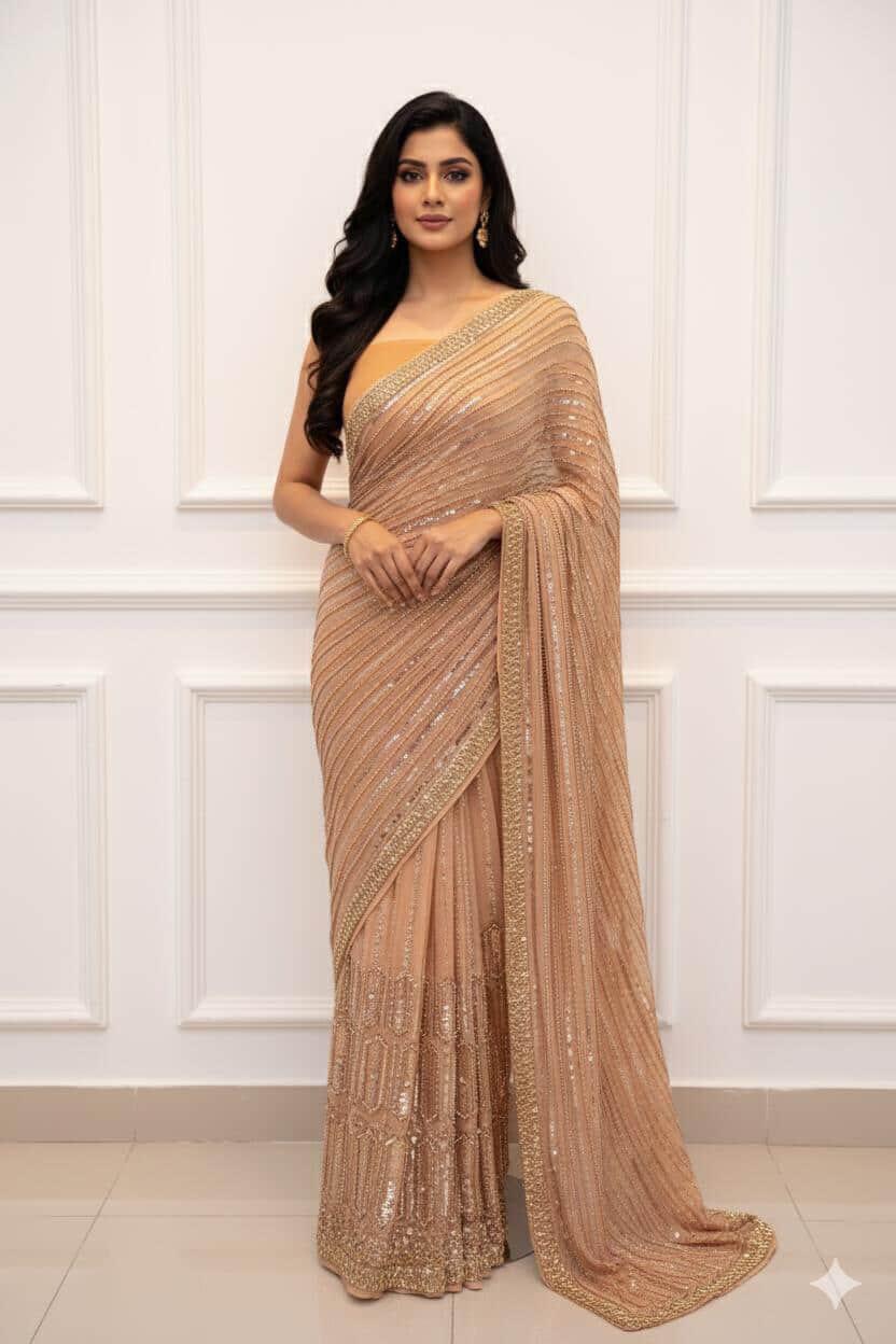 A beautifully fully embroidered peach saree.
